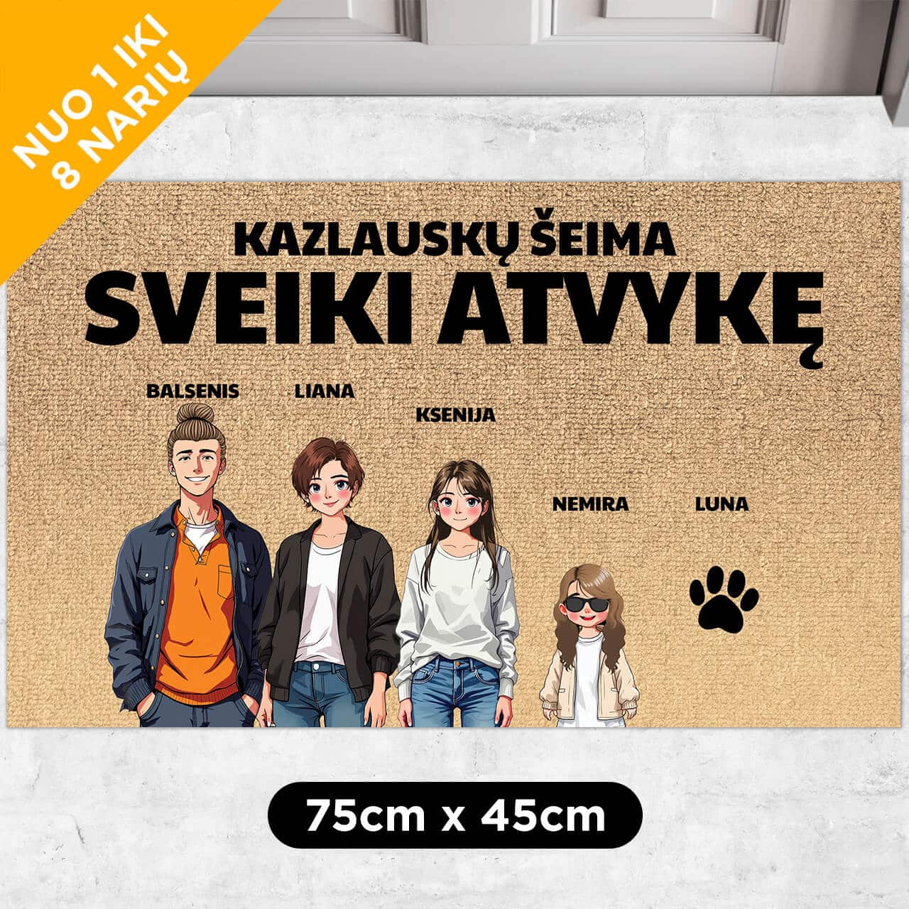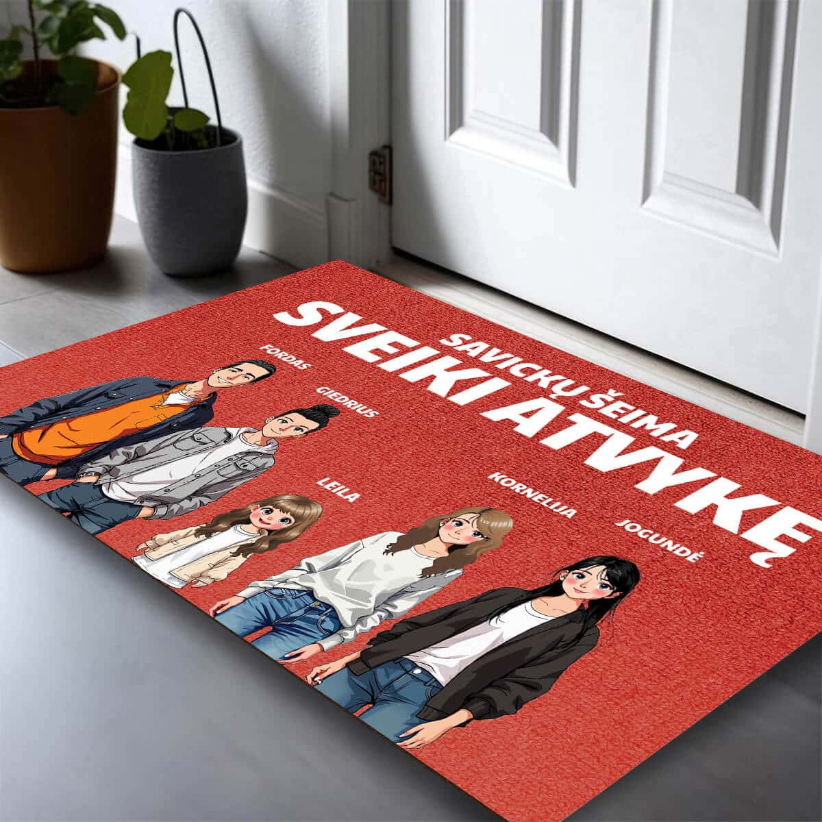 Paverskite savo namų slenkstį animaciniu šedevru! Šiame visiškai pritaikomame kilimėlyje vaizduojami žavūs anime stiliaus personažai, vaizduojantys jūsų šeimą – net augintinius!